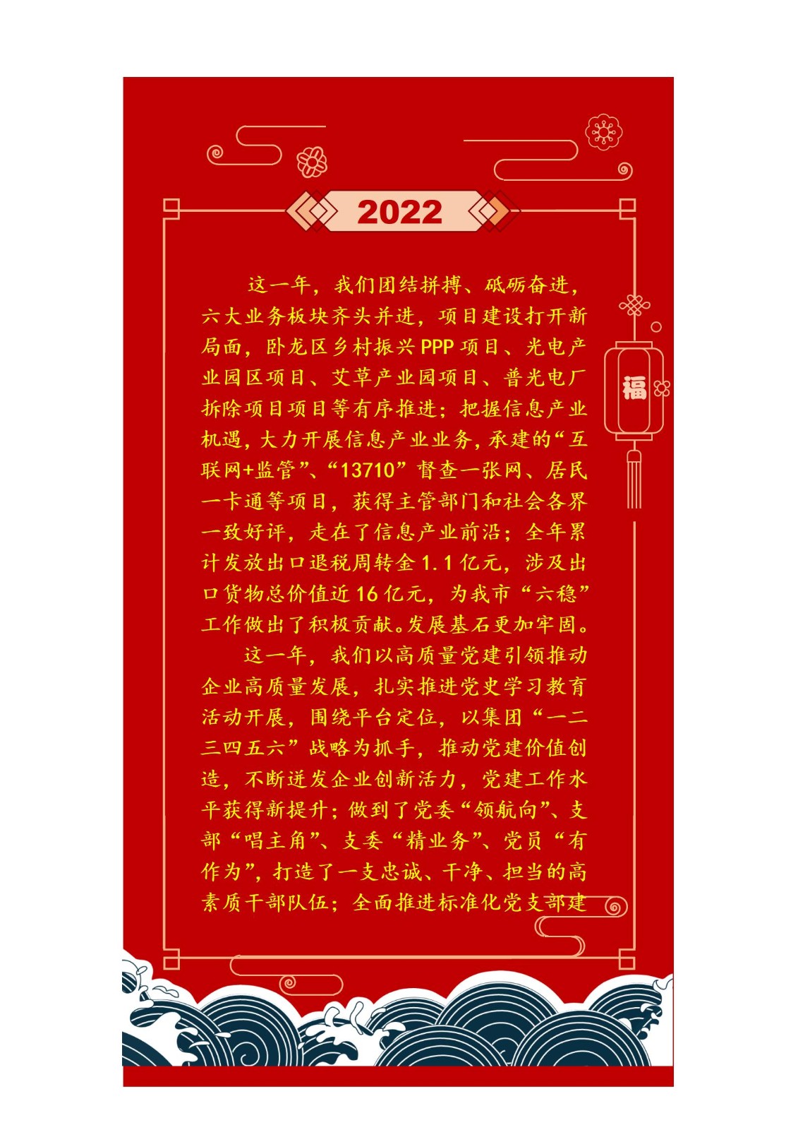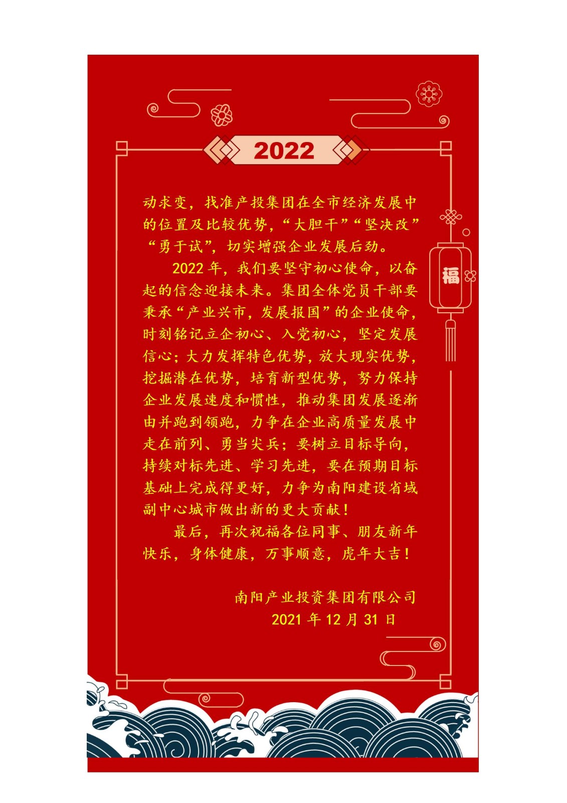 余永海強(qiáng)調(diào),2022年要重點(diǎn)落實(shí)集團(tuán)“一二三五十”工作布局?!耙弧笔峭怀霎a(chǎn)業(yè)發(fā)展這條主線,“二”是強(qiáng)化人才強(qiáng)企、創(chuàng)新發(fā)展兩大戰(zhàn)略,“三”是堅(jiān)持穩(wěn)健經(jīng)營、風(fēng)險(xiǎn)控制、效益提升三大原則,“五”是抓好“五項(xiàng)重點(diǎn)”、“十”是抓實(shí)“十大項(xiàng)目”。切實(shí)抓牢黨建引領(lǐng)、廉政護(hù)航、制度規(guī)范、系統(tǒng)賦能、安全生產(chǎn)“六個(gè)保障”,努力打造成為“功能專業(yè),業(yè)績一流,管理卓越,運(yùn)轉(zhuǎn)高效”的國有資本運(yùn)營公司,為南陽建設(shè)副中心城市做出新的更大貢獻(xiàn)。